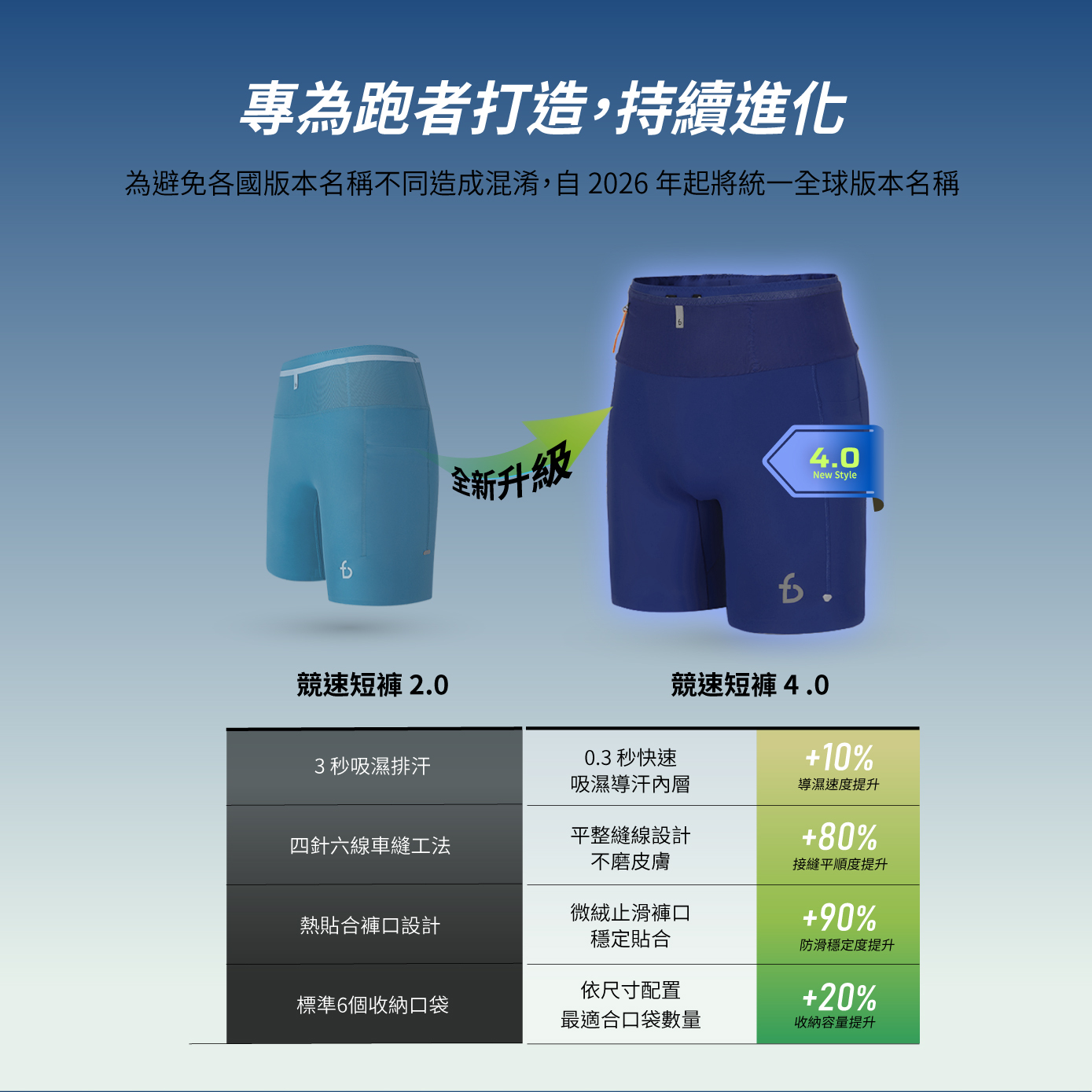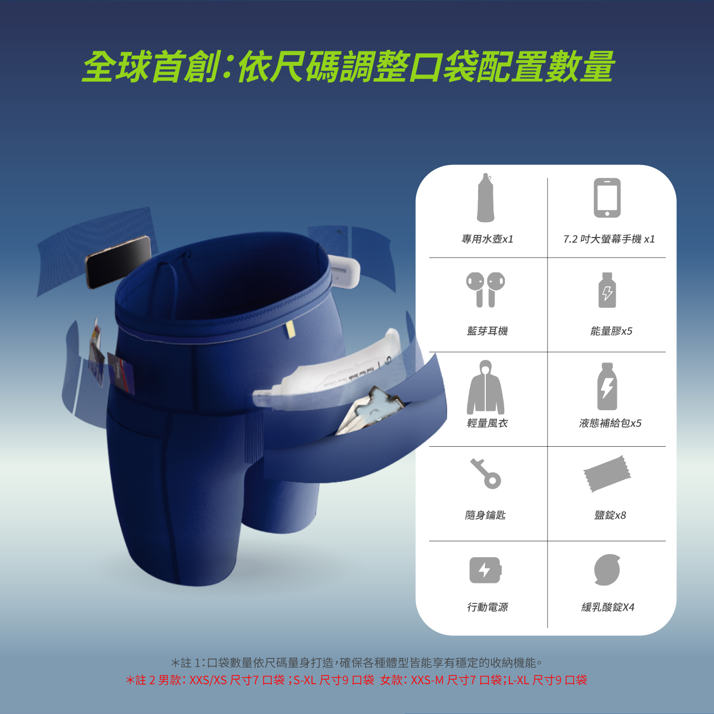 本次升級導入全球首創「依尺碼配置口袋數量」設計,讓收納更貼合身形、降低跑動晃動;
