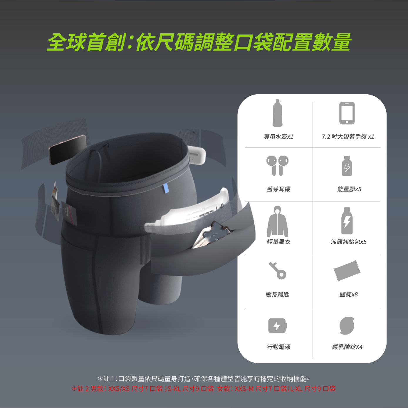 本次升級導入全球首創「依尺碼配置口袋數量」設計,讓收納更貼合身形、降低跑動晃動;